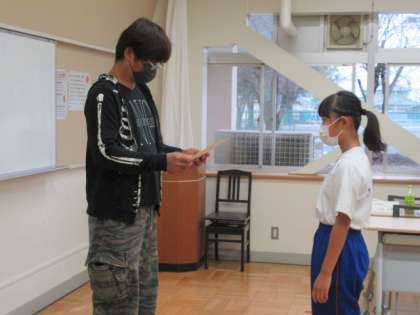 10月13日(水) 「満点朝ご飯レポート」表彰(1) 公開日 2021/10/13 更新日 2021/10/13 できごと 学校保健委員会終了後、PTA会長様、PTA保健委員長様・副委員長様により、「満点朝ご飯レポート」の表彰式が行われました。 写真は、保健副委員長様による1年生の金賞・銀賞の表彰です。