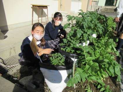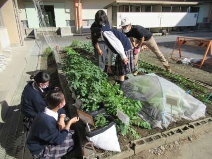 藤岡北高校の先生と生徒さんが来校し、今日は、畑の野菜の生育状況のチェックや野菜に付いた虫の駆除などをしてくださいました。野菜が丈夫に育つよう、高校の授業で学んだ知識と技術を生かし、様々な工夫をしてくれたり、中学生に伝授してくれたりしています。
