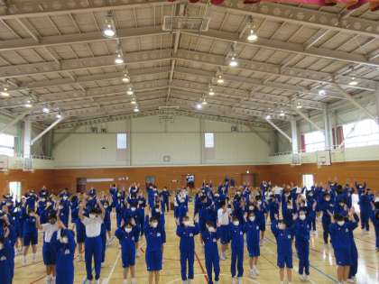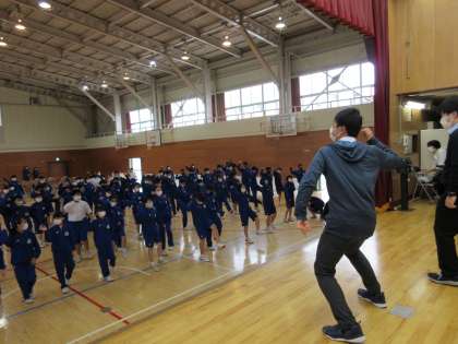 10月19日(火) 北斗祭 全校ダンスの練習(1年) 公開日 2021/10/19 更新日 2021/10/19 できごと ダンスの中間発表を終えた1年生は、ひと安心したりもっと練習しなければと意欲を燃やしたりしたようです。その気持ちは最後に学年で踊った全校ダンスにも表れ、ステージ上の先生とともに元気いっぱい踊っていました。北斗祭を、自分たちも盛り上げ、成功させようと意欲を燃やす1年生でした。