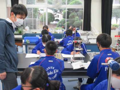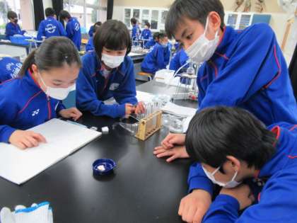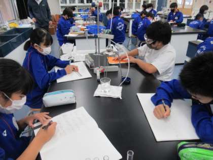 10月19日(火) 1年生理科の授業 公開日 2021/10/20 更新日 2021/10/20 できごと 1年生理科の授業では、蒸留したお酒(水とエタノールの混合物)の成分が分けられたことを確かめる方法を探りました。氷を入れる、火をつける、油を入れるなど条件を変えて実験に臨みました。実験装置を見つめる目は真剣そのものです。変化に気づき仲間に伝えたりノートに記録したりと、よいチームワークを発揮して課題解決を図っていました。