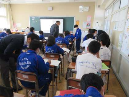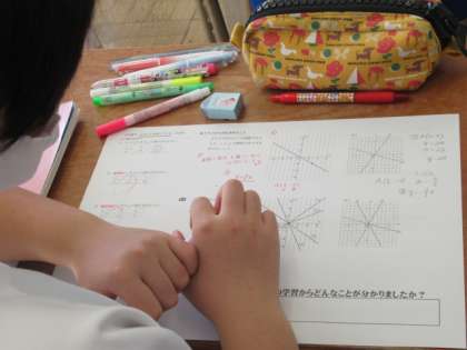1年生の数学では、比例の学習のまとめに取り組みました。関数y=ax、そのグラフの特徴を確認し、比例定数の求め方、yをxの式で表すと?などを復習しました。次いで、表を読み取って比例定数を求めての立式に入りました。表を見ただけでぱっと分かる生徒も多く見受けられましたが、先生からは、きちんと整理して考えるために途中式を省略せずに丁寧に解答するよう助言がありました。また、スクリーンに映した問題プリントにポイントが書き込まれたことで、より正確に復習することができました。次時は、グラフからの立式の復習で㊙テクニックを伝授するとの先生の言葉に、生徒は先の見通しを持ち、好奇心をくすぐられたようでした。
