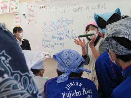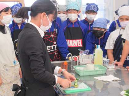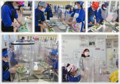 2年生の家庭科では、調理用具を正しく安全に衛生的に扱う技術、調理室の使い方を身に付けるため、キュウリを使った調理実習を行っています。これまでの授業で、輪切りや拍子木切りなどの切り方を提示資料や動画で学習してきた生徒たちは、教育実習の先生の示範を見たことで、より理解を深めて実技に臨みました。実習中も先生は、安全面や衛生面、環境面、切り方やドレッシングの計量の助言に余念がありません。班での教え合いも多く見られるようになり、充実した調理実習となりました。飛沫防止ガードを使用しての試食も楽しそうに、美味しそうな表情の生徒たちでした。