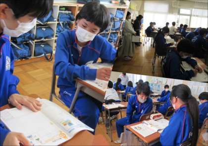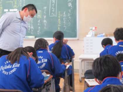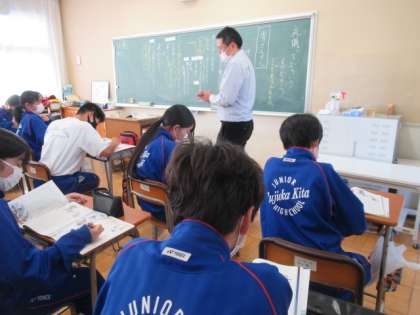 2年生の今日の道徳は、『秀さんの心』という読み物資料を通して礼儀について考える授業でした。造園職人の秀さんが、共に働く昌雄をなぜ注意したのか?そのときの秀さんの心情は?など、発問に対する考えをノートに書かせて発言を促しました。生徒が考えに詰まると、友達とノートを見せ合わせて話し合う時間を設けるなど、一人一人が考えを持てるように、また、違った見方・考え方に気付けるように配慮されていました。先生と生徒の和やかなやり取りの中、生徒は安心して自分の考えを表出できる授業でした。