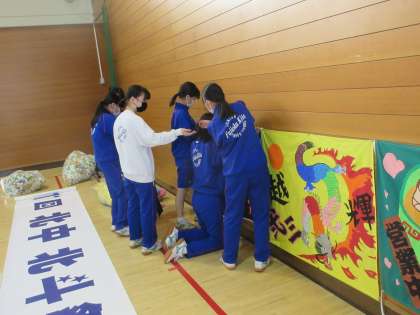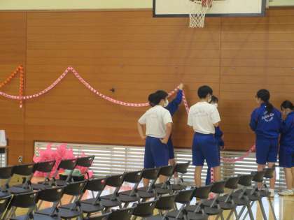 準備が進み、いよいよ会場の飾り付けが完成しました。でも、完成した会場は、明日のお楽しみです。