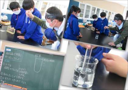 1年生の理科では、硝酸カリウムを湯煎しながら水に溶かした後、再結晶した物質を取り出す実験を行いました。水の入ったビーカーに入れた試験管内に変化が起こると、よく見つめていた生徒は小さく歓声を上げました。その後、取り出した物質の特徴について調べました。