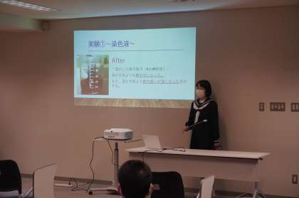 写真は、1年生徒による研究「水はけの悪さの秘密を探れ!!」の発表(上)と、2年生徒による研究「染色液を自分で作ろう!」の発表(下)の様子です。