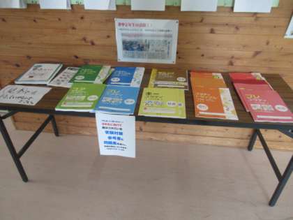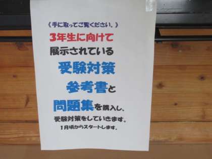 2年生の廊下に、「受験対策用参考書・問題集」が展示されました。来年4月の進級に向けて、学年全体で1月頃から取り組んでいくとのことです。生徒はもちろんのこと、面談のために来校された保護者の方にも手に取っていただけるようになっています。