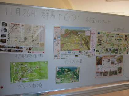 11月11日(木)2年生のフロアに行ってみると、11月26日に開催される校外学習「ぐんまGO」の見学地を紹介されていました。