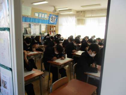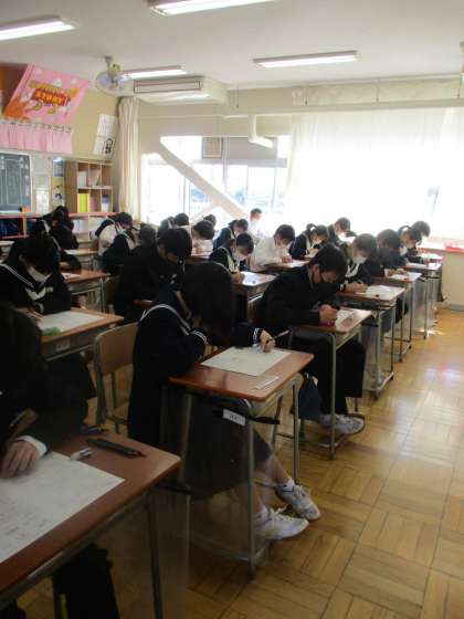 11月11日(木) 3年生 期末テスト1日目 公開日 2021/11/12 更新日 2021/11/12 できごと 11月11日(木)2階のフロアでは、3年生が期末テストを行っていました。 今、まさに三者面談中の3年生にとっては、特に重要な意味を持つ期末テストです。 緊張感が伝わってきました。