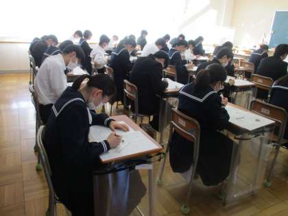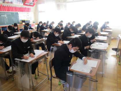 11月12日(金) 3年生期末テスト2日目 公開日 2021/11/12 更新日 2021/11/12 できごと 11月12日(金)3年生は期末テスト2日目を迎えました。 最後まで、諦めずに取り組んでほしいと思います。 頑張れ、3年生!