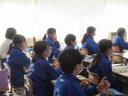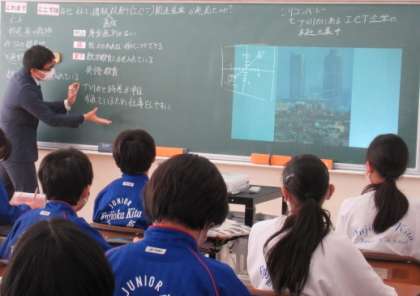 1年生の社会では、「なぜ、インドで情報通信技術(ICT)関連産業が発展したのか」について学習を進めていました。これまで、インドの人権問題や貧困等について学んできた生徒は、「差別の制度がなくなった」「教育(数学や英語)が進んだ」などとめあてについて考えました。提示された資料や地図などから、取引の相手国との時差の関係なども出てくるなど、生徒は活発に意見を出しながら真剣に考えていました。