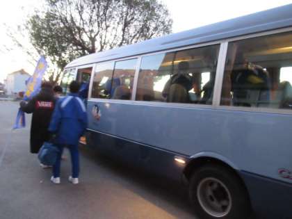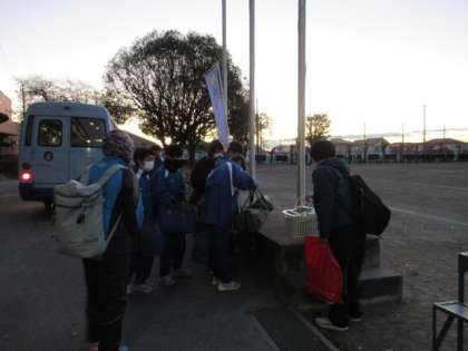 “がんばれ 北中”の幟旗や必要な用具類を分担して持ち、バスに乗り込み、6時に渋川市総合公園瑞穂建設スタジアムへと出発しました。