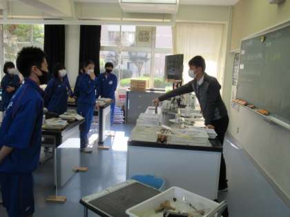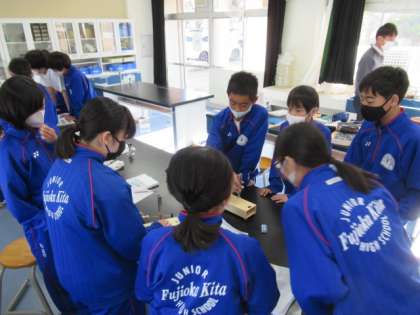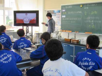 1年生の理科では、音の正体と伝わり方について学習を進めています。まずは、人と話す、机を叩く、糸電話で話すなどを実際にやってみて共通点を探りました。また、音叉を使っての実験を通して、音の正体は“振動”であることを学習しました。鳴り続ける目覚まし時計を置いた入れ物の中を真空にすると音が聞こえなくなり、空気を入れると再び音が聞こえてくることを実験映像で見ると、生徒は目を輝かせて音の正体を実感していました。