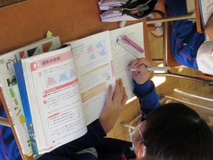 11月17日(水)2年生数学の授業 公開日 2021/11/17 更新日 2021/11/17 できごと 2年生の数学では図形の合同について学習しています。「頂点」「辺」「対角線」「角」など、これから合同の証明をする時に必要となる用語や表し方を学んでいました。今後、今日学んだ数学の用語を使って合同であることについて説明する力を付けていってほしいと思います。