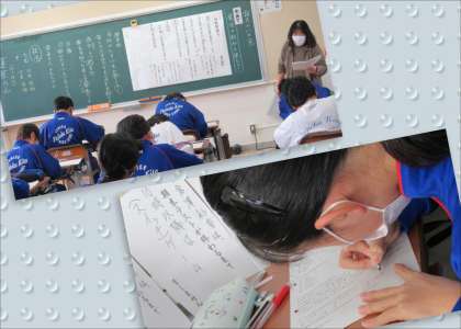 国語では、古典『竹取物語』の中でも有名な「蓬莱の玉の枝」の読み取りに取り組んでいました。歴史的仮名遣いや、係り結びなどの技法を学びながら、かぐや姫の世界を読み味わいました(写真上)。美術では、ドアプレートのアイディアスケッチに取り組んでいます。おもて面と裏面のどちらも“なるほど”と思わせるようなスケッチは、なかなか難しいのですが、これまでの発想トレーニングの成果を発揮して頑張っているところです(写真中)。社会では、ヨーロッパの宗教について、人々の生活や当時の支配者の考えなどと関連付けながら学習を進めていました。先生の歴史のこぼれ話などにも興味津々の様子でした(写真下)。