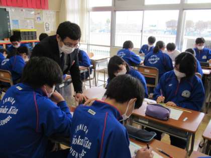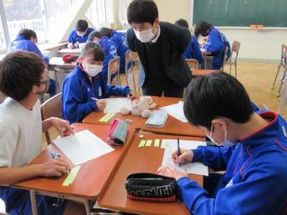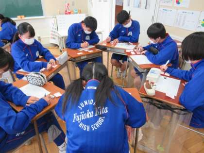 3年生の道徳では、「ジョハリの窓」を活用したグループワークに取り組みました。自分の性格についての自他の認識のズレを知り、その原因を探り、他者の認識を受け入れることで、コミュニケーションの円滑化、対人関係のストレス軽減などを図ることができる手法です。小グループに分かれた生徒たちは、自分の性格と友達の性格を付箋紙に記入し、交換した“自他共に認める性格”“自分は気付かないが友達が認める性格”など4つの項目に分類する作業には、少なからず緊張感が漂った様子です。希望の進路の実現を目指す今の時期、新たな気付きが自己理解を深め、頑張ろうという気持ちに繋がることでしょう。
