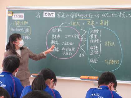 3年生の家庭科では、消費生活にかかわる学習を進めています。社会的問題にもなっている消費行動を解決するには、正しい知識が必要という認識のもと、今日の授業では、家庭の金銭の収支における注意点について考えました。