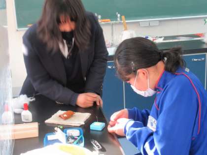 11月18日(木) 高校生との交流(1) 公開日 2021/11/18 更新日 2021/11/18 できごと 毎週木曜日に来校し、学校菜園の野菜栽培等に協力してくださる藤岡北高校の生徒さんたち。今日は、7組の生徒たちにキーホルダー作りを教えてくれました。フェルトのマスコットを、限られた時間の中で中学生が製作して完成させられるようにと、途中まで作っておいてくれました。