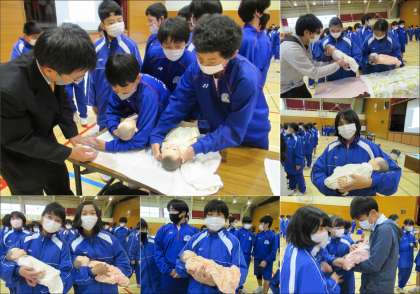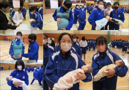 助産師さんや保健師さん、先生たちの指導のもと、赤ちゃんの安全な抱っこ体験と妊婦さんの体験に取り組む生徒たちの様子です。