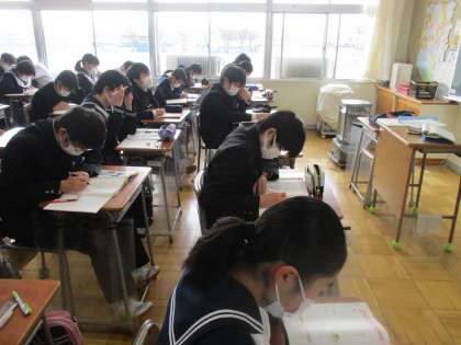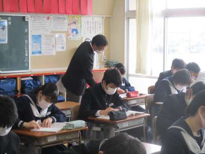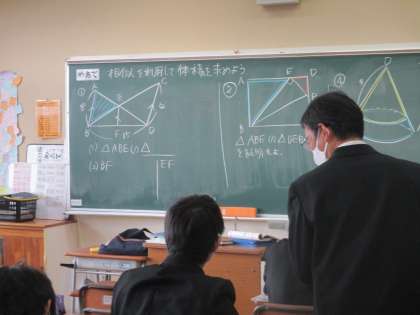 12月10日(金)3年生数学の授業 公開日 2021/12/10 更新日 2021/12/10 できごと 3年生数学の授業の様子です。 今日は、相似の学習のまとめです。 章末の問題にチャレンジしました。今までに習ったことのない難しい問題に苦戦する生徒も少なくなかったようです。 「なるほど、そこに気づけばいいのか。」という声が聞こえてきそうでした。