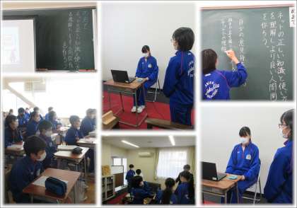 人権強化週間の一環として、今日の4時間目に全クラスで「ネットの正しい知識と使い方を理解し、より良い人間関係を作ろう」のめあてのもと、インターネット・リテラシーについて学習しました。インターネット・リテラシーとは、インターネットの情報を正しく理解し、それを適切に判断、運用できる能力を意味します。 インターネット上でのトラブルに巻き込まれないためにはどんなことが必要かを考えました。