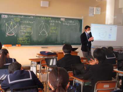 12月13日(月)3年生数学の授業 公開日 2021/12/13 更新日 2021/12/13 できごと 3年生数学の授業の様子です。 今日は、円周上にできる角の性質について考えました。 「どうして円周角は中心角の2分の1といえるのか?」