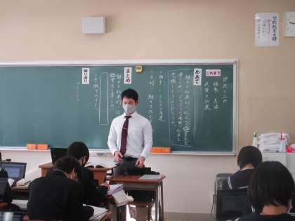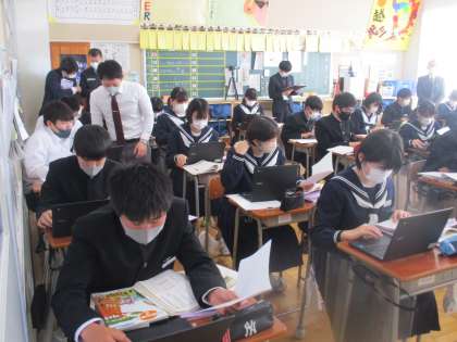 本日1時間目、2年3組の教室では、担当である群馬大学の准教授の先生をお迎えし、今年度群馬大学教職大学院で研鑽を積んでいる本校の先生による研究授業が行われました。教科書にある美術作品の魅力を効果的に伝える鑑賞文をかくために意識する表現の効果について考える授業です。