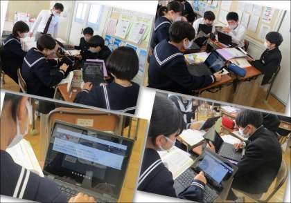 生徒は、美術作品から受けた抽象的な印象やそう考えた根拠を、具体的な観点で説明したり、表現の効果を意識したりして、クロームブック(PC)の共有機能を用いて、意見交流を行いました。