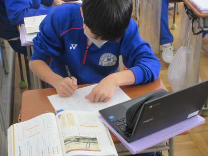 生徒は、クロームブックで各々が既習事項を振り返り、「構成」や「文末表現」に着目して原稿用紙に向かいました。
