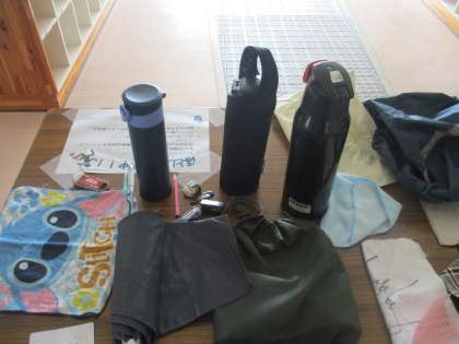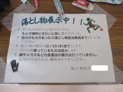 生徒玄関に忘れ物が展示されています。 心あたりがある生徒は、見に来てください。