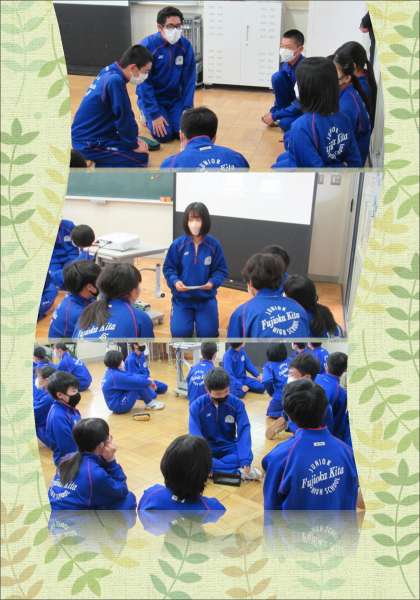 12月16日(木) 縦割り活動で折り紙の花束づくり(2) 公開日 2021/12/16 更新日 2021/12/16 できごと アイスブレーク第1弾の自己紹介では、好きな教科や好きな曲、寝る前に考えていることなどを発表し合っていました。1・2年生の緊張をほぐそうと、3年生が楽しく話したり、下級生の発表ぶりを上級生が寛容に受けとめたりと、微笑ましい光景が見られました。第2弾の「言うこと逆 やること一緒」では、オンラインでの例示を見ながら、各教室で大いに盛り上がりました。