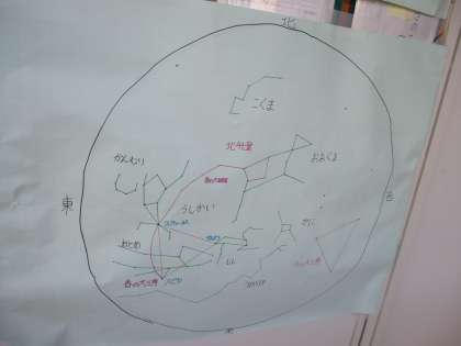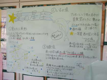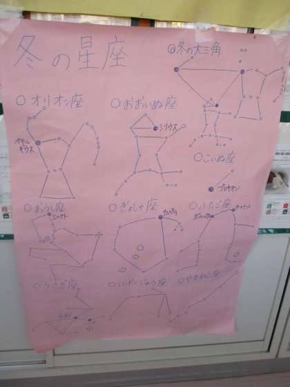 3年生の廊下には、天体の学習のまとめとして、これまで学習したことをもとに、夜空に浮かぶ星座を模造紙にまとめ、掲示してあります。