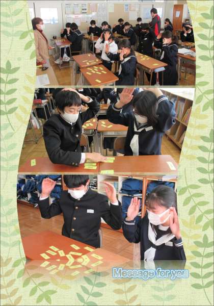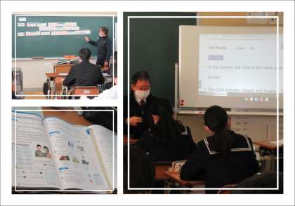 2年生の英語の授業の様子です。写真上は、カードになった「不規則な変化の動詞」を臨席の生徒とカルタ形式で取り合いながら身に付けていく学習をしています。think−thought、drink−drankなどの単語を、ALTの先生たちと楽しみながら覚えていました。写真下は、比較級や最上級の復習の後、「綴りの長い形容詞を使った比較文」の学習に入りました。デジタル教科書を使い、先生と生徒で元気よく本文を読み上げていました。