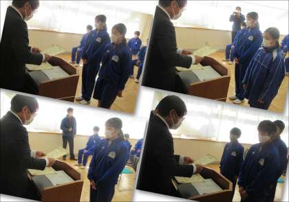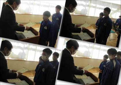 お昼休みに第9回表彰式を西会議室で行いました。今回、表彰されるのは、「第6回藤岡市ジュニアマラソン大会」「令和3年度読書感想画中央コンクール」「第73回藤岡市小中学校書き初め展」「令和3年度よい歯の学級コンクール」「令和3年度校内書き初め大会」の入賞者です。