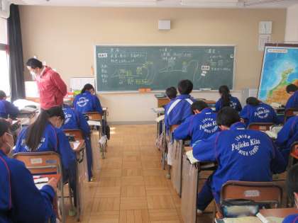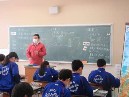 2年生の社会の授業では、東海地方の特色を産業の視点から学習し、生徒は、最後に、学んだことをもとに「まとめ」を自分の言葉で書いていました。ズズキのオートバイやヤマハの楽器が東海地方の特色を生かして発展してきたことを理解することができました。