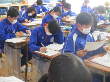 2月9日(水)2年生英語の授業 公開日 2022/02/09 更新日 2022/02/09 できごと 2年生英語の授業の様子です。 きょうは、期末テスト前ということで、今まで習ったテスト範囲の中から予想問題を作成するというミッションにチャレンジしました。 これまでの本文を見直したり、ワークの問題を見返したりしながら、出題者の立場に立って、今回の期末テスト出題のポイントを考えながら問題を作成していました。