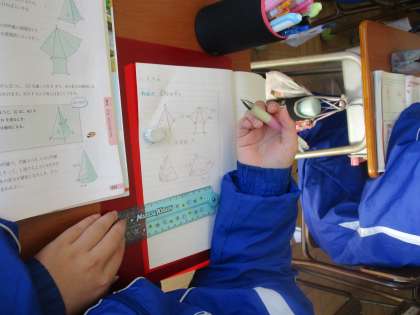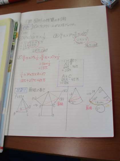 2月9日(水)1年生数学の授業 公開日 2022/02/09 更新日 2022/02/09 できごと 1年生数学の授業の様子です。 角錐や円錐の最短距離問題にチャレンジしました。 最短距離とはどんな状態のことか・・・。 このポイントを押さえて、各自でチャレンジ。できた人は友達と共有していました。