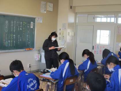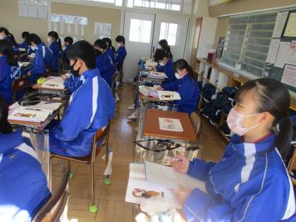 2月9日(水)1年生国語の授業 公開日 2022/02/09 更新日 2022/02/09 できごと 1年生国語の授業の様子です。 「少年の日の思い出」ヘルマンヘッセ 今日は、クジャクヤママユをめぐる「僕」の行動と心情を叙述に即して読み取りました。