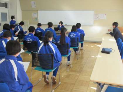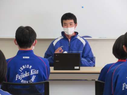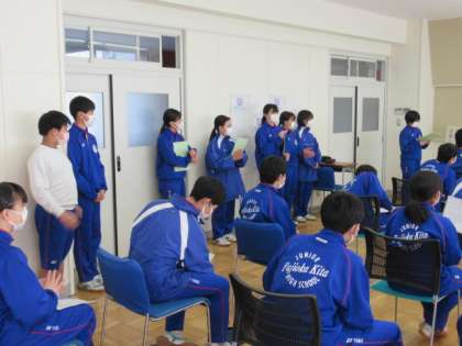写真は、各部長による活動報告のリハーサルの様子です。各部の今年度の活動内容と成果、次年度の活動目標等を全校生徒に分かりやすく伝えるため、顧問の先生からの助言を得ながらしっかりと報告書にまとめました。