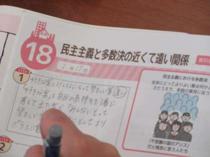 サバイバル生活を行うときに、水、塩、コート、本……の中で何が役に立つのか、実際にグループで話し合いを行い、必要なものの順位を決めました。その上で、どんな話し合いになったのか、話し合いの中でどんなことを意識したのか振り返り、決めごとをする時に大切にしたいことについて自分の気づきをノートに書きました。