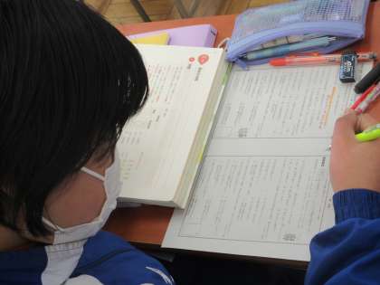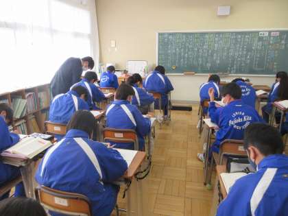 2月21日(月) 2年生国語の授業 公開日 2022/02/21 更新日 2022/02/21 できごと 2年生の国語の授業では、助詞について学習しました。助詞の種類について先生の説明を聞きながらしっかりと学んだあと、プリントを使って実際に識別しました。文法の学習の中で手強い助詞ですが、生徒は黒板をヒントに問題をすらすらと解いていました。