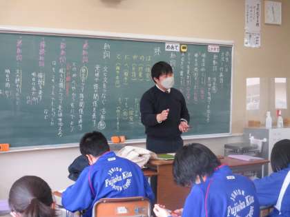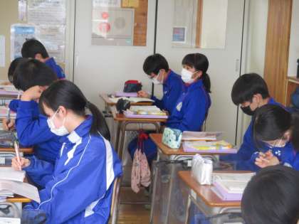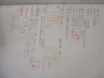 3月8日(火)2年生国語の授業 公開日 2022/03/08 更新日 2022/03/08 できごと 2年生国語の授業の様子です。 文法の学習です。付属語のうち、これまでは「助動詞」について考えましたが、今回は「助詞」の種類と意味について学びました。 後半には、学んだ知識をより確実になるようにワークをどんどん進めていました。