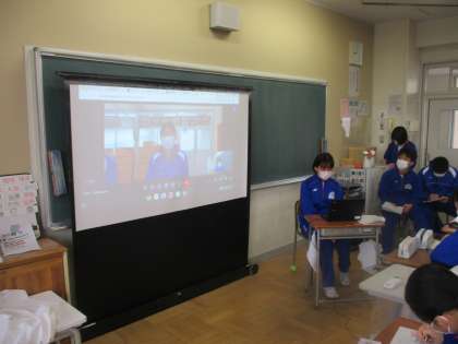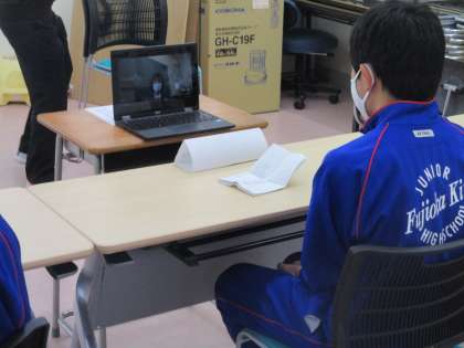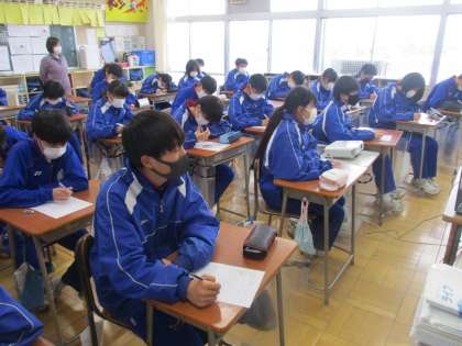 群馬県公立高校の後期選抜2日目の本日1時間目。3年生の愛校作業をしている傍らで3年生の代表者が、2年生に対して、受験の体験等について伝える機会として「3年生の話を聴く会」が行われました。今回は、3年生は大事な卒業式前ということで、感染予防のためにmeetによるオンライン形式で別室と繋いで実施しました。