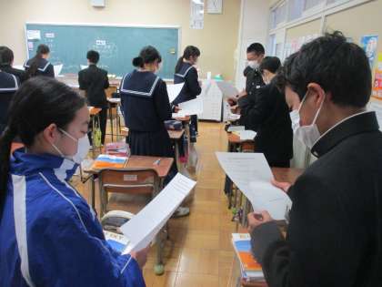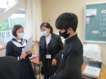 4月14日(木) 2年生英語の授業 公開日 2022/04/14 更新日 2022/04/14 できごと 2年生英語の授業の様子です。 4月より転任してこられた先生と昨年度もお世話になったALTの二人による授業です。英語で自己紹介を考えて、ペアになって実際にコミュニケーションをとっていました。 学年が一つ上がりクラス替えにより、新しい友達も多いことと思います。 自分らしさを英語で上手く伝えられたでしょうか。 教室内はとても盛り上がっていました。
