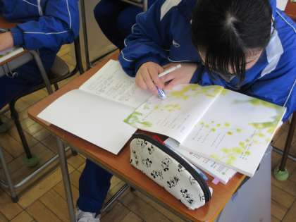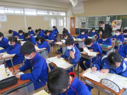 4月15日(金) 2年生国語の授業 公開日 2022/04/15 更新日 2022/04/15 できごと 2年生の国語では教科書の扉のページにある「見えないだけ」の詩について学習しました。「これまで」学んできた表現技法について振り返り、それをつなぎ教材として、この詩に使われている表現技法を見つけ、感動の中心となる表現技法をヒントにこの詩のよさについて自分の考えを書きました。生徒はノートに自分の考えを集中して書くことができました。