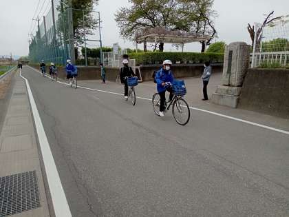 正門を通り過ぎる自転車通学の生徒と、正門から校内に入る徒歩通学の生徒に対して、気持ちのよいあいさつの声をかけてくださっています。