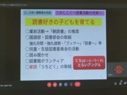 4月19日(火) 北連携型小中一貫校 合同研修会(1) 公開日 2022/04/19 更新日 2022/04/19 できごと 北中学校・藤岡第二小・神流小の合同研修会をオンラインで行いました。「コミュニティ・スクールを基盤とした小中一貫教育」を、三校の教員が同じ方向を目指して進めるという意味から「ポラリス(北斗星)」と名付けた本研修会。はじめに、北中・山田校長から方針説明として、9年間で目指す児童・生徒の姿と、そのための手だてについて話がありました。