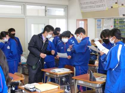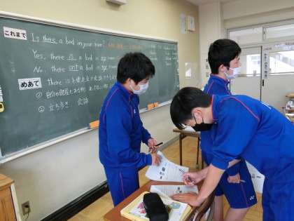 今日のめあては、「There is〜を使った文で会話できるようになろう」。ワークシートを手に教室内を移動してたくさんの友達と会話を交わし、学んだ表現を繰り返し声に出していました。