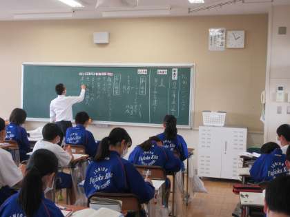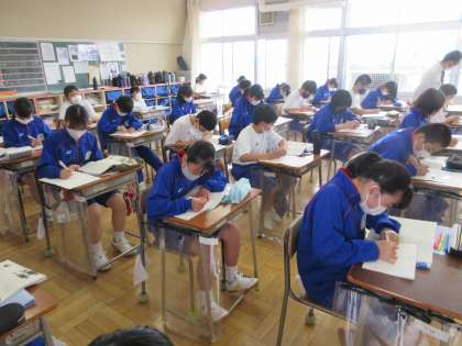 4月21日(木) 1年生国語の授業 公開日 2022/04/21 更新日 2022/04/21 できごと 1年生の国語では物語文の読み取りをおこなっていました。「これまで」読み取った主題を確認し、第1場面、第2場面の内容を読み取り、二人の主人公の仲が深まった理由について考えました。黒板にはネームプレートが貼られ、生徒の活躍がたくさん見られました。