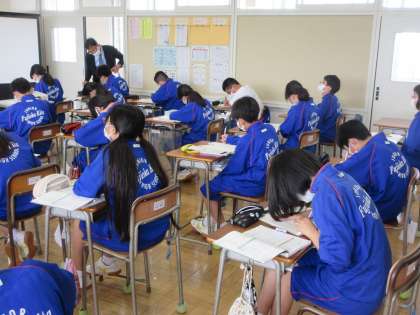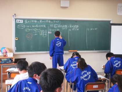 4月21日(木) 1年生数学の授業 公開日 2022/04/21 更新日 2022/04/21 できごと 最大公約数と最小公倍数の求め方について学習しました。みんなで例題を解き、練習問題に取り組みました。問題が解けた生徒は積極的に黒板へ出て、問題を解いていました。